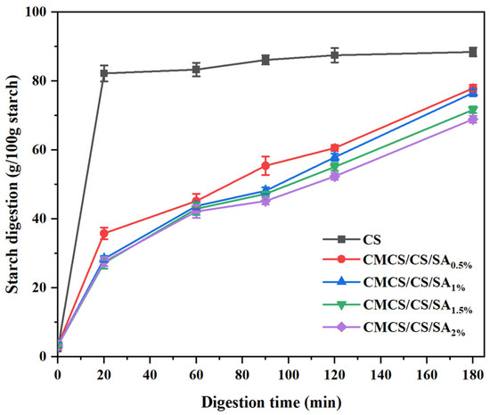 The in vitro digestive kinetics of CS and sample microcapsules at different time intervals are illustrated in Figure 3. Compared with corn starch, the construction of the shell significantly reduced the digestion rate of starch, and the difference between CMCS/CS/SA0.5% and CMCS/CS/SA2% was significant. CS exhibited a starch digestibility of 82.254% at 20 min and 87.690% at 120 min, with the rate of starch digestion remaining relatively constant thereafter. In comparison, the starch hydrolysis rate of CMCS/CS/SA microcapsule samples decreased. With the SA concentration increasing from 0.5% to 2%, the digestibility of CMCS/CS/SA microcapsules decreased from 35.818% to 27.649% at 20 min and from 77.969% to 68.961% at 180 min. It was noted that as the SA concentration varied in CMCS/CS/SA microcapsules, an increase in SA concentration correlated with a decrease in the digestion rate of the microcapsules. At low SA concentrations, the network structure formed was weak, making it challenging to effectively resist amylase hydrolysis. Conversely, with higher SA concentrations, the network between SA and CMCS strengthened, forming a more effective barrier against amylase, thus impeding further starch hydrolysis and reducing the digestion rate. Park et al. [41] demonstrated that microspheres formed by CA and calcium chloride could elevate the RS content of waxy CS in starch microspheres.