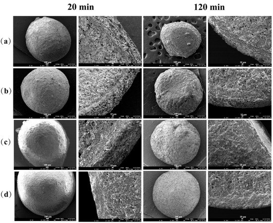 The surface and cross-section SEM images of the four prepared microcapsules after 20 min and 120 min of in vitro digestion are presented in Figure 4. As the hydrolysis time increased from 20 min to 120 min, the microcapsules visibly decreased in volume, and the degree of surface shrinkage decreased, likely due to the expulsion of internal starch from pores. During the digestion process, amylase could penetrate the microcapsules through pores generated during in vitro digestion, hydrolyze starch, and subsequently, upon lyophilization, the volume of microcapsules decreased. With the increase in SA concentration, the network structure of the microcapsules became denser, and higher concentrations of SA resulted in thicker microcapsule walls, effectively preventing the entry of starch-digesting enzymes and the dissolution of starch, thereby helping to maintain the original spherical appearance. Additionally, the cross-sectional diagrams reveal that as digestion progressed, the internal pores of the 120 min microcapsules were more pronounced than those of 20 min microcapsules, likely due to the porous structure left by amylase hydrolyzing starch. Despite digestion, the walls of the microcapsules formed by CMCS/CS/SA remained clearly visible and intact at the edges, indicating that the wall material formed by CMCS/CS/SA could withstand digestion, demonstrating a good anti-digestion effect and potential use as an anti-digestion wall material. Microcapsules with higher concentrations of SA also exhibited denser and thicker shells. The slower the structural changes observed on the surface and interior, the slower the hydrolysis rate of starch, corresponding to the digestion curve, highlighting the crucial role of the shell in resisting amylase hydrolysis. Li et al. [42] confirmed that short-chain amylose coated by SA microspheres was effectively protected during gastrointestinal digestion, with the calcium alginate shell playing a crucial role in preventing digestive enzymes from entering the microspheres.