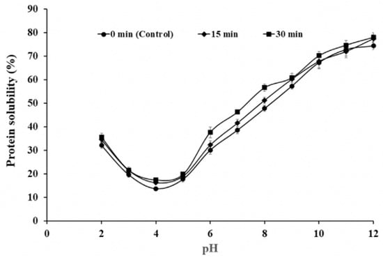 Figure 5 that it is a typical bell-shaped curve, with the lowest solubility at pH 4. And it can be found that, compared with the control treatment, the protein solubility significantly increased in the pH range of 6–8 for 30 min of ultrasound. This underscores the multifaceted influence of processing parameters on the solubility dynamics of canola seed protein.