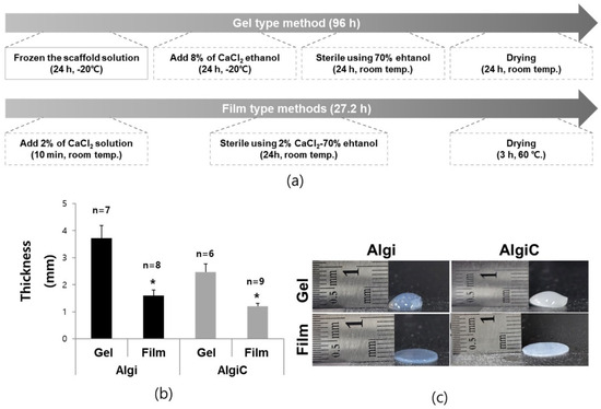 Production time and thickness comparisons of gel-type and film-type Algi-based scaffolds. (a) The film-type scaffold preparation time was compared to that of gel-type scaffold preparation. (b,c) Gel-type scaffolds showed uneven surfaces and lacked flatness, whereas film-type scaffolds exhibited even surfaces and substantially reduced thicknesses (Scale bar = 1 cm, *: p < 0.05, n = sample number).