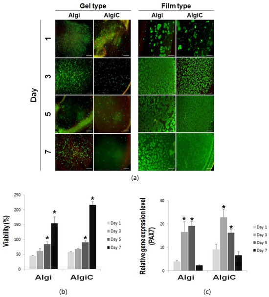 PAX7 expression significantly increased on days 3 and 5 in both Algi and AlgiC scaffolds but significantly decreased by day 7 in both scaffolds (Figure 3c). These results suggest that proliferation was strongly promoted on days 3–5 but subsequently decreased. Thus, plant-based film scaffolds provide an adequate environment for cell attachment and proliferation, with myoblasts surviving for at least 7 days.
