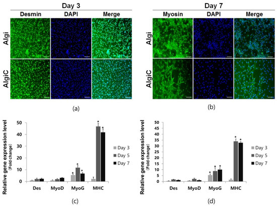 Desmin and MyoD, markers of early-stage differentiation; MyoG, an intermediate-stage marker; and MHC or Myosin, end-stage markers, were analyzed. Relative gene expression results indicated a slight increase in early marker expression, Desmin and MyoD were elevated on both Algi and AlgiC scaffolds on days 5 and 7 compared to day 1. MyoG expression increased on day 5 in both scaffolds. MHC expression significantly increased on both film-type scaffolds on days 5 and 7 (Figure 4c,d). These results suggest that myoblasts can reach final-stage differentiation on film scaffolds.