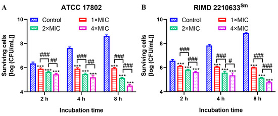 Surviving population of V. parahaemolyticus ATCC 17802 (A) and RIMD 2210633Sm (B) during exposure to different concentrations of punicalagin. *** p ≤ 0.001 versus the control; # p < 0.05, ## p ≤ 0.01, ### p ≤ 0.001 for comparison between punicalagin treatments.