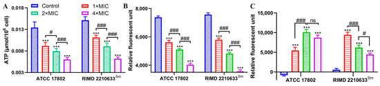 Changes in intracellular ATP (A), pH (B), and membrane potential (C) of V. parahaemolyticus ATCC 17802 and RIMD 2210633Sm following punicalagin treatment. *** p ≤ 0.001 versus the control; # p < 0.05, ### p ≤ 0.001 for comparison between punicalagin treatments. ns, no significant difference.