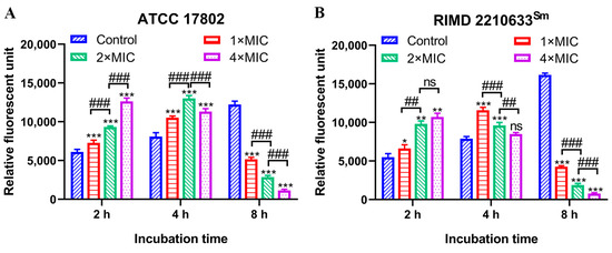 The outer membrane permeability of V. parahaemolyticus cells was determined using an NPN uptake assay as previously described [17]. The 1 mL V. parahaemolyticus suspensions (~108 CFU/mL) supplemented with punicalagin (0, 1×, 2×, 4× MIC) were incubated at 37 °C with 190 rpm shaking. After 2, 4, and 8 h, cell suspension was centrifugated (5000× g, 4 °C, 5 min), washed, and resuspended in HEPES buffer, followed by the addition of 10 μL NPN (0.5 mM in acetone). The suspension was incubated for 10 min in the dark at room temperature, and fluorescence intensities were measured (Ex 360 nm; Em 465 nm).