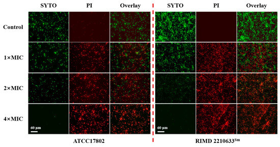 The bacterial suspension was treated with various concentrations of punicalagin (0, 1×, 2×, 4× MIC) and cultured for 2 h at 37 °C. The V. parahaemolyticus cells were collected via centrifugation (10,000× g, 4 °C, 2 min), washed, and resuspended in PBS. Afterward, cells were stained with PI (30 μM) and SYTO (10 μM) at room temperature without light for 20 min. The cell samples were washed thoroughly with PBS to remove free probes and examined using a fluorescence microscope (Revole, Echo, San Diego, CA, USA). Confocal images of green (SYTO) and red (PI) were observed with the Overlay mode.