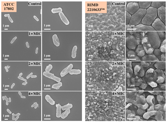 To visualize the effect of punicalagin on cell injury, FE-SEM was used to observe the morphology changes of V. parahaemolyticus after treatment with punicalagin. As shown in Figure 6, in the control, V. parahaemolyticus ATCC 17802 and RIMD 2210633Sm all exhibited a typical pleomorphic structure of Gram-negative coccobacillus, showing full and plump rod-shapes or slightly curved arc shapes with an intact cell envelope as well as a regular and smooth surface. By comparison, visible shrinkage and wrinkles for V. parahaemolyticus ATCC 17802 and several more serious deformations, including collapse and cell lysis, for RIMD 2210633Sm arose in punicalagin-treated cells at 1× MIC. What is more, cells treated with 2× and 4× MIC punicalagin displayed extensive cell deformations, cell membrane disruption, and the leakage of cytoplasm, with the severity of cell damage increasing in a dose-dependent manner.