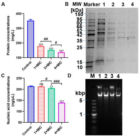 The protein concentration (A) and SDS-PAGE profile (B) of the bacterial protein of V. parahaemolyticus ATCC 17802 following punicalagin treatment. Lane 1: control; Lanes 2, 3, and 4: sample treated with 1×, 2×, and 4× MIC punicalagin, respectively. The DNA concentration (C) and AGE pattern of genomic DNA (D) of V. parahaemolyticus ATCC 17802. Lane M: marker; Lane 1: control; Lanes 2, 3, and 4: sample treated with 1×, 2×, and 4× MIC punicalagin, respectively. ** p ≤ 0.01, *** p ≤ 0.001 versus the control; # p < 0.05, ## p ≤ 0.01, ### p ≤ 0.001 for comparison between punicalagin treatments. ns, no significant difference.