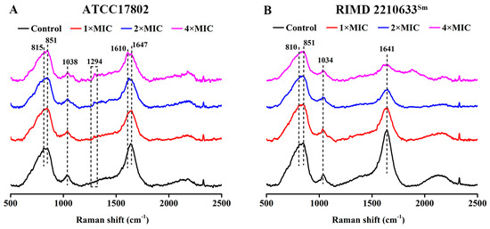 Raman spectrum of V. parahaemolyticus ATCC 17802 (A) and RIMD 2210633Sm (B) exposed to punicalagin.