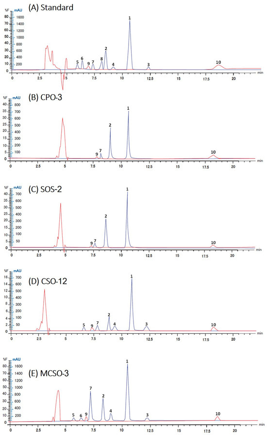 Chromatograms of analyzed samples. (A) Standard solution, (B) cold-pressed sesame oil (CPO), (C) sesame oil supplements (SOS), (D) sesame cooking oil (SCO), and (E) sesame cooking oil mixed with other oils (MSCO). Peak identification: 1 = sesamin, 2 = sesamolin, 3 = sesamol, 4 = asarinin, 5 = α-tocopherol, 6 = β-tocopherol, 7 = γ-tocopherol, 8 = δ-tocopherol, 9 = squalene, and 10 = phytosterol.