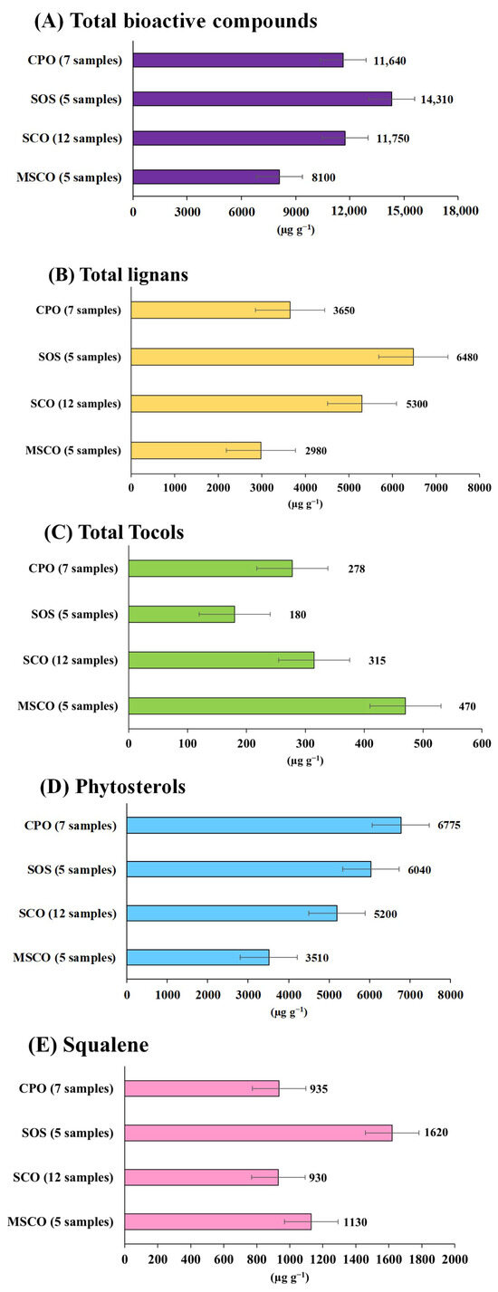 Furthermore, the bioactive compounds of roasted and non-roasted sesame seeds in sesame cooking oil (SCO group) were compared. Tocopherol contents in sesame oil from both roasted and non-roasted sesame seeds were quite indifferent (316 and 313 µg g−1, respectively). Roasting sesame seeds improved the extraction of lignans, as the lignan content in the oils was higher (5619 µg g−1) than that of the oil from non-roasted seeds (4791 µg g−1). In addition, by roasting sesame seeds before oil extraction, squalene contents were decreased (887 and 1000 µg g−1 for roasted and non-roasted, respectively), and phytosterol contents were increased (5370 and 4835 µg g−1 for roasted and non-roasted, respectively).