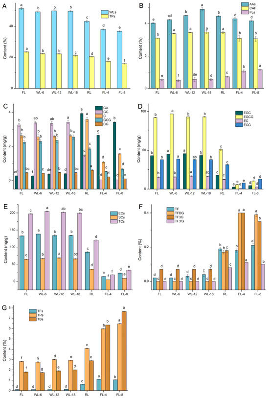 Contents of quality components during WBT processing. (A,B), quality compounds; (C–E), catechins; (F,G), tea pigments. Data are presented as the mean ± SD (standard deviation) and were assessed by one-way ANOVA. The different lowercase letters indicate the least significant difference (p < 0.05). WEs, water-soluble extracts; TPs, tea polyphenols; AAs, amino acids; CAF, caffeine; FLs, flavonoids; GA, gallic acid; GC, gallocatechin; C, catechin; GCG, gallocatechin gallate; CG, catechin gallate; EGC, epigallocatechin; EGCG, epigallocatechin gallate; EC, epicatechin; ECG, epicatechin gallate; ECs, ester catechins; SCs, simple catechins; TCs, total catechins; TF, theaflavin; TFDG, theaflavin-3, 3′-digallate; TF3G, theaflavin-3-gallate; TF3′G, theaflavin-3′-gallate; TFs, theaflavins; TRs, thearubigins; TBs, theabrownines; FL, fresh leaves; WL-6, withering 6 h; WL-12, withering 12 h; WL-18, withering 18 h; RL, rolling; FL-4, fermenting 4 h; FL-8, fermenting 8 h.