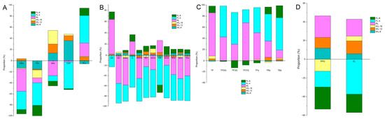 As shown in Figure 2, WL-12 and WL-18 had the greatest effect on amino acids, accounting for 16.39% and 24.47%, respectively. RL had the greatest effect on water-soluble extracts, accounting for 40.98%, followed by amino acids and flavonoids, accounting for 27.02% and 24.22%, respectively. The effects of FL-4 on flavonoids, caffeine, tea polyphenols and water-soluble extracts were the highest in all processing nodes, accounting for 49.17%, 48.47%, 40.90%, and 33.03%, respectively. FL-8 had a great impact on tea polyphenols and flavonoids, accounting for 19.18% and 13.40%, respectively (Figure 2A). However, WL-6, WL-12, and WL-18 had little effect on catechins. The contents of all catechins decreased by FL-4. RL and FL-4 had the greatest effect on catechins, together accounting for more than 80%. Among them, GA, GC and EGC accounted for 61.84%, 53.9%, and 53.8% by RL, respectively. The proportions of C, EC, GCG, CG, ECG and ester catechins impacted by FL-4 were 50.81–64.59%. FL-8 had a great effect on GA, C, CG and ECG, accounting for more than 10% (Figure 2B). WL-6, WL-12, and WL-18 had little effect on tea pigments. RL increased the content of all tea pigments. RL and FL-4 had the greatest effect on tea pigments, which accounted for more than 72% when combined. Among them, TF, TF3′G and total theaflavins impacted by RL accounted for 77.52%, 68.24%, and 48.31%, respectively. The proportions of TFDG, TF3G, total theaflavins, thearubigins, and theabrownines impacted by FL-4 were between 45.41% and 57.96% (Figure 2C).