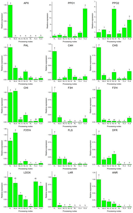 Relative expression of regulatory gene during the processing of WBT. Data are presented as the mean ± SD (standard deviation) and were assessed by one-way ANOVA. The different lowercase letters indicate the least significant difference (p < 0.05). APX, ascorbate peroxidase; PPO1, polyphenol oxidase 1; PPO2, polyphenol oxidase 2; PAL, phenylalanine ammonialyase; C4H, cinnamate 4-hydroxylase; CHS, chalcone synthase; CHI, chalcone isomerase; F3H, flavanone 3-hydroxylase; F3′H, flavonoid-3′-hydroxylase; F3′5′H, flavonoid3′, 5′-hydroxylase; FLS, flavonol synthase; DFR, dihydroflavonol 4-reductase; LDOX, leucoanthocyanidin dioxygenase; LAR, leucoanthocyanidin reductase; ANR, anthocyanidin reductase; FL, fresh leaves; WL-6, withering 6 h; WL-12, withering 12 h; WL-18, withering 18 h; RL, rolling; FL-4, fermenting 4 h; FL-8, fermenting 8 h.