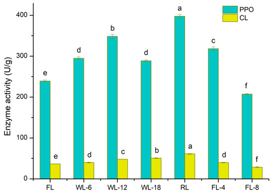 Activities of PPO and CL during the processing of WBT. Data are presented as the mean ± SD (standard deviation) and were assessed by one-way ANOVA. The different lowercase letters indicate the least significant difference (p < 0.05). PPO, polyphenol oxidase; CL, cellulase; FL, fresh leaves; WL-6, withering 6 h; WL-12, withering 12 h; WL-18, withering 18 h; RL, rolling; FL-4, fermenting 4 h; FL-8, fermenting 8 h.