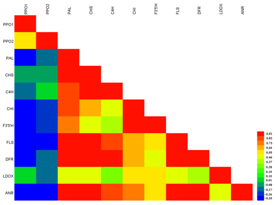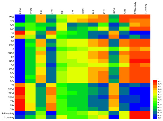 In view of the low relative expression levels of 4 genes—F3H, F3′H, LAR, and APX—during WBT processing, we only conducted correlation analysis for the other 11 genes. PPO1, PPO2 and LDOX had no significant correlation with all the detected genes (Figure 5). F3′5′H was only significantly correlated with CHI at the 0.01 level, and CHI was only significantly correlated with PAL and F3′5′H at the 0.05 level. PAL, CHS, C4H, FLS, DFR, and ANR were significantly correlated with each other at the 0.01 level. The fact that most genes of the flavonoid pathway were closely related to each other, indicating that gene groups of the same metabolic pathway tend to be similar in expression. Almost no significant correlation was found between enzyme activity and gene expression when analyzed with different nodes simultaneously, and the same phenomenon existed when correlation was analyzed between quality components and enzyme activity or gene expression. As shown in Figure 5, PPO activity was significantly negatively correlated with PPO1 and CHS at the 0.01 level but not with other genes. Additionally, the activity of CL was negatively correlated with PPO1 and LDOX at the 0.05 level but not with other genes.