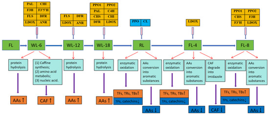 RT-qPCR analysis showed the relative expression levels of 15 genes in flavonoid metabolism pathway (12 genes, such as PAL, C4H, CHS, CHI, F3′5′H, F3H, DFR, LAR, LDOX, ANS, ANR, etc.), APX, PPO1 and PPO2 (Figure 3). PAL, C4H, CHS, F3′H, F3H, DFR, LAR, ANS, ANR, and APX were significantly down-regulated during processing (Figure 3). LDOX was also down-regulated during processing, but the expression trend was different from that of the other 14 genes. Surprisingly, the expression trends of PAL, C4H, CHS and DFR genes were consistent. Specifically, the expressions of CHI and F3′5′H genes showed the same trend, being up-regulated in WL-6 1.05 times and 1.34 times more than fresh leaves, respectively, and significantly down-regulated in subsequent nodes. In addition, the expression of PPO1 and PPO2 was up-regulated → down-regulated → up-regulated → down-regulated → up-regulated, and their expression levels in WL-18 were 6.37 times and 5.59 times of those in fresh leaves, respectively, while the expression levels in FL-8 were 17.74 times and 3.43 times of those in fresh leaves, respectively.