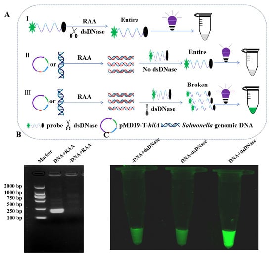 Schematic diagram and feasibility analysis of RAA-dsDNase detection for Salmonella. (A) The principle of RAA-dsDNase detection for Salmonella mainly includes three parts. (I) dsDNase has no degrading activity on ssDNA fluorescent probe. (II) When dsDNase was absent from the reaction system, the ssDNA fluorescent probe remains intact. (III) When the template DNA was amplified by RAA, then dsDNase was added to the system, and the ssDNA fluorescent probe was degraded and released a fluorescent signal. (B,C) Feasibility analysis of RAA-dsDNase detection for Salmonella.
