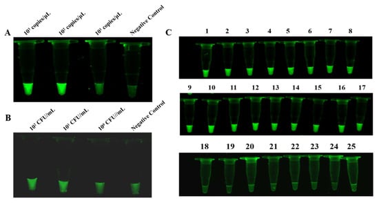 The detection limit of one-pot RAA-dsDNase-UV was determined by sensitivity analysis to be 101 copies/μL for plasmids and 101 CFU/mL for bacteria (Figure 4A,B). Additionally, Figure 4C,D show that the one-pot RAA-dsDNase-LFD detection limits were 102 copies/μL for plasmids and 102 CFU/mL for bacteria. The results of the specificity investigation were in perfect agreement with RAA-dsDNase (Figure 5).