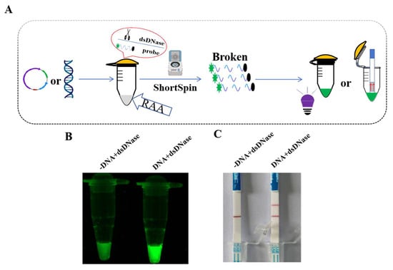 Schematic diagram and feasibility analysis of one-pot RAA-dsDNase-UV and one-pot RAA-dsDNase-LFD detection for Salmonella. (A) Simultaneously adding the components of the RAA and dsDNase reactions into an EP tube, with RAA at the bottom of the tube and dsDNase and the fluorescent probe at the tube cap. After the RAA reaction was completed, it was briefly centrifuged, inverted to mix, and finally the results were observed using UV and LFD. (B,C) The feasibility analysis results showed that fluorescence or detection bands appeared only when the genomic DNA of Salmonella existed.