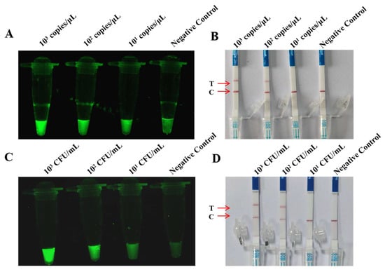 Sensitivity analysis of one-pot RAA-dsDNase-UV and one-pot RAA-dsDNase-LFD. (A,C) The detection limit of one-pot RAA-dsDNase-UV was 101 copies/μL (plasmid) and 101 CFUs (bacteria). (B,D) The detection limit of one-pot RAA-dsDNase-LFD was 102 copies/μL (plasmid) and 102 CFU/mL (bacteria).