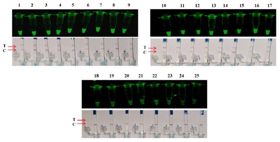 We conducted a one-pot RAA-dsDNase experiment, which reduced the possibility of contamination and simplified the reaction process despite the high specificity and sensitivity of RAA-dsDNase. The findings were visualized using UV and LFD. The schematic diagram for a one-pot process is shown in Figure 3A. This method involved adding the fluorescent probe, ddH2O, and dsDNase to the tube lid after the RAA mixture was positioned at the tube’s bottom. Fluorescence or detection bands were only created in EP tubes containing DNA templates, as shown in Figure 3B,C. This indicates that the one-pot RAA-dsDNase-UV and one-pot RAA-dsDNase-LFD procedures are feasible.