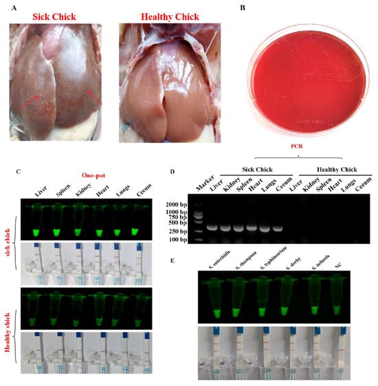 Detection of Salmonella in real samples. (A) Observation of liver tissue samples from sick and healthy chickens in clinical practice with the naked eye. The red arrow indicates the location of the nodule. (B) Traditional culture method was used to analyze Salmonella in the tissues of sick chickens, and the results showed typical morphology of Salmonella pullorum. (C) One-pot RAA-dsDNase-UV, one-pot RAA-dsDNase-LFD, and PCR analysis showed that significant fluorescent signals or detection bands were produced in the tissues of the hearts, livers, spleens, lungs, kidneys, and intestines of sick chicks, while no corresponding phenomenon was observed in healthy chicken tissues. (D) And similar results were obtained from PCR analysis. (E) Detection of Salmonella in milk using one-pot RAA-dsDNase-UV and one-pot RAA-dsDNase-LFD showed that both methods produced clear fluorescent signals or detection bands.