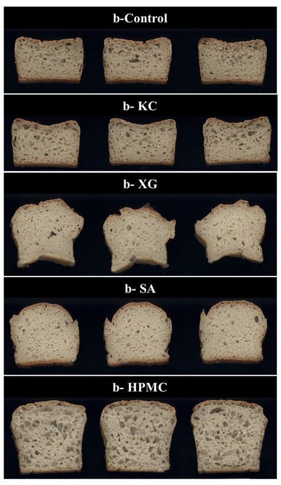 The values of baking loss are reported in Table 5. The lowest value of baking loss (7.38%) was obtained for breads made by adding HPMC to the dough. Similar values were also recorded for the b-XG sample (7.98%). Significantly different values were recorded for the bread samples obtained via the addition of sodium alginate (10.30%) and k-carrageenan (10.64%), which had values that were not significantly different from the control sample having the highest value of baking loss (11.13%). The baking loss values for quinoa-based breads reported in this study were similar to those found by Franco et al. [41], which were ~9–10.5%. Table 5 also shows the values for the height (cm) of the bread slices. The lowest height (3.83 cm) was recorded for sample b-Control. Similar values were also recorded for sample b-KC (3.93). The samples, b-SA and b-XG, recorded values of 4.90 cm and 5.20 cm, respectively. The highest slice height (6.77 cm) was recorded for sample b-HPMC.