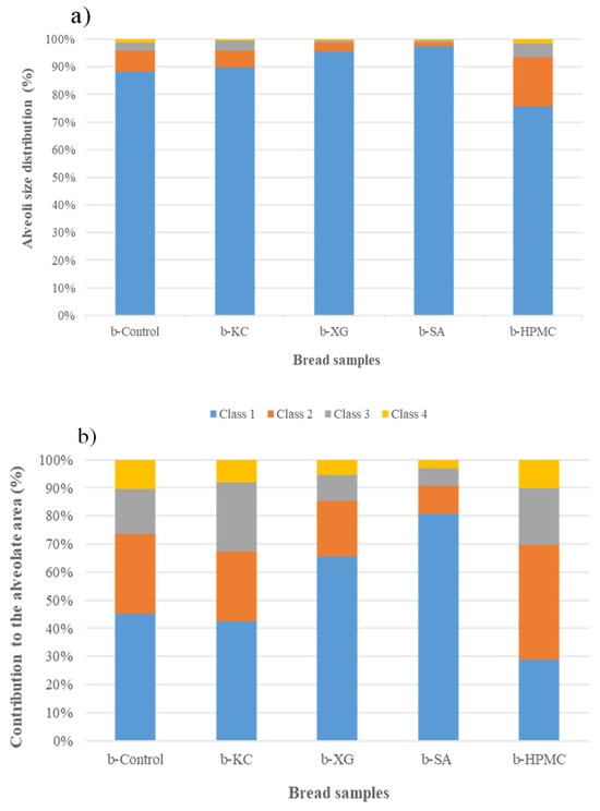The bread obtained with the addition of k-carrageenan (b-KC) showed a profile similar to that of the control bread (b-Control). On the other hand, the bread obtained with the addition of HPMC showed a more open crumb structure. In this sample (Figure 3a), a higher percentage of alveoli was detected, also belonging to classes 3 (7.47 < cell size < 11.16 mm2) and 4 (11.16 < cell size < 14.84 mm2). As reported by Sciarini et al. [43], gluten-free bread has a high cell-wall thickness and a coarse and dense structure due to the inability to incorporate gases during mixing and/or to retain the CO2 formed during fermentation due to the lack of a viscoelastic network. Among the hydrocolloids evaluated for the production of quinoa-based bread, HPMC was the one most capable of forming a reversible, heat-set gel network, which can lead to an increase in dough viscosity and stabilization of the boundaries of the expanding gas cells, as already evidenced by other authors [44,45]. In fact, as shown in Figure 3b, in the b-HPMC sample, the alveoli of classes 2, 3, and 4 contributed to the alveolar area of the bread slice, resulting in a bread with a uniform distribution of bubbles and no areas of crumb collapse. Clear areas of crumb collapse near the crust were mainly characteristic of the b-XG and b-SA samples (Figure 1). In addition, the b-XG sample also showed slight deformation of the loaf, as evidenced by the bread slices in Figure 1.