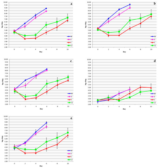 Microbial group counts of beef treatments as a function of storage time: (a) TVC, (b) pseudomonads, (c) Brochothrix thermosphacta, (d) lactic acid bacteria, (e) Enterobacteriaceae. W—control; Z—AgIon® pad; C—chitosan; CZ—chitosan + AgIon® pad.