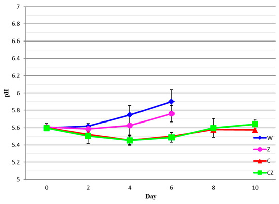 pH values of beef treatments as a function of storage time. W—control; Z—AgIon® pad; C—chitosan; CZ—chitosan + AgIon® pad.