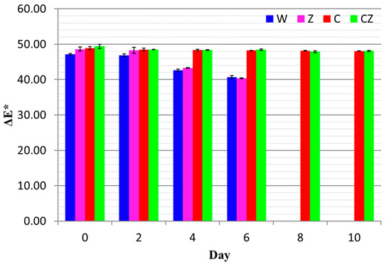 For treatments W and Z, the ΔE values decreased from ca. 48 to 40.5 on day 6 of storage (p < 0.05), while the ΔE values for treatments C and CZ decreased from ca. 49 to 48 (p > 0.05) on day 10 of storage, indicating the protective effect of chitosan on meat color. According to Mokrzycki et al. [37], changes in the visual color of samples can only be clearly identified by an observer if ΔE* > 3.5. Such a total color difference was noted only in the W and Z treatments.