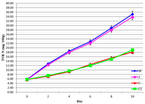 TVBN values of beef treatments as a function of storage time. W—control; Z—AgIon® pad; C—chitosan; CZ—chitosan + AgIon® pad.