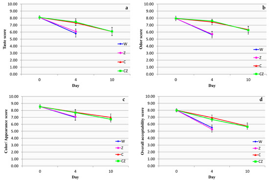 Sensory evaluation of cooked beef treatments as a function of storage time: (a) taste, (b) odor, (c) color/appearance, (d) overall acceptability. W—control; Z—AgIon® pad; C—chitosan; CZ—chitosan + AgIon® pad.