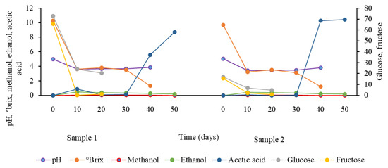 Chemical analysis was performed at 0, 10, 20, 30, and 40 days of fermentation. The samples were analyzed for total soluble solids (°brix), pH, glucose, fructose, methanol, ethanol, and acetic acid. In addition, analyses of ethanol, methanol, and acetic acid were conducted on day 50.