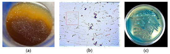 The mother of vinegar containing AAB and extracellular materials formed on the top layer of sample 2 during spontaneous fermentation (a). A microscopic picture of a Gram-stained film (mother of vinegar) shows AAB stained red (arrows) with the appearance of filaments (e.g., inside rectangle) of extracellular matrix produced by AAB (b). Mixed growth of various Acetobacter and Gluconobacter on GYPEC subcultured from the enrichment broth showing colonies with various shades of blue/green color (c).
