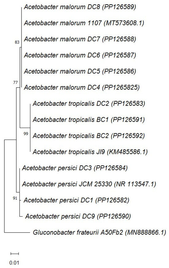 The phylogenetic analysis of Acetobacter based on 16S rRNA gene sequences is shown in Figure 3. Each species, A. malorum, A. tropicalis, and A. persici, made a distinct clear cluster with strong bootstrap values (83, 99, and 91, respectively). The sequences of the three species that were retrieved from the GenBank clustered also with their respective species isolated in this study.