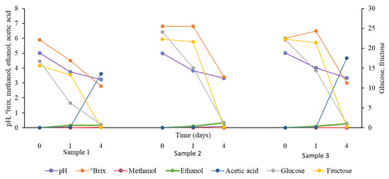 Changes in pH, °brix, glucose (mg/g), fructose (mg/g), ethanol (%), methanol (%), and acetic acid (%) throughout fermentation in samples 1, 2, and 3 inoculated with starter cultures 1 (Acetobacter, Glucononbacter, and yeast), 2 (Gluconobacter and yeast), and 3 (Acetobacter and yeast), respectively.