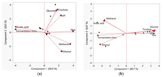 Principal component analysis (PCA) biplot performed with pH, °brix, glucose, fructose, ethanol, methanol, and acetic acid concentrations, and fermentation time for vinegar samples prepared through (a) spontaneous fermentation and (b) inoculation with starter cultures.