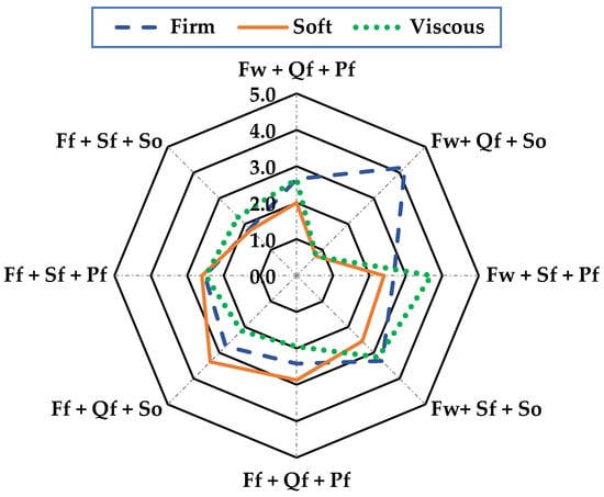 Texture in mouth evaluation of sausages of A. rivulatus. Ff: Fish farm, Fw: Fish wild; Sf: Soya flour, Qf: Quinoa flour; Pf: Pork fat, So: sunflower oil.