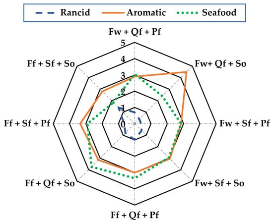 Smell in mouth evaluation of sausages of A. rivulatus. Ff: Fish farm, Fw: Fish wild; Sf: Soya flour, Qf: Quinoa flour; Pf: Pork fat, So: sunflower oil.