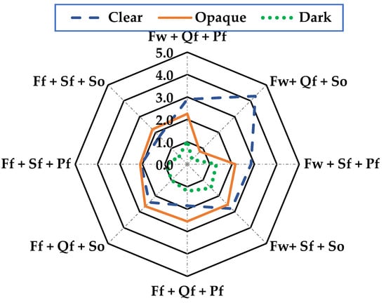 The product’s sensory properties are crucial to achieving consumer acceptance of this new product. The sensory analysis was based on the texture in the mouth, smell, color, and taste of the sausage, with the factors “Wild + Quinoa flour + Sunflower oil” presenting the best sensory characteristics in all the parameters evaluated. In texture in the mouth (Figure 1) with a range of 0 to 5, it presented a firmness value of 4.2, making it acceptable, while for odor (Figure 2), it showed 4.5 in the aromatic characteristic, which was the highest and most acceptable value; for color (Figure 3), it was more evident with 4.3 acceptability, and finally, flavor (Figure 4) was 4.3, meaning it was mostly pleasant for the evaluators. These results agree with those described by [] for Panga sausage, while the ratings described for tilapia sausage by [] are much lower, with an overall acceptability of 3.2 on a 0–4 scale, making the Old Blue (A. rivulatus) sausage more palatable to the consumer.