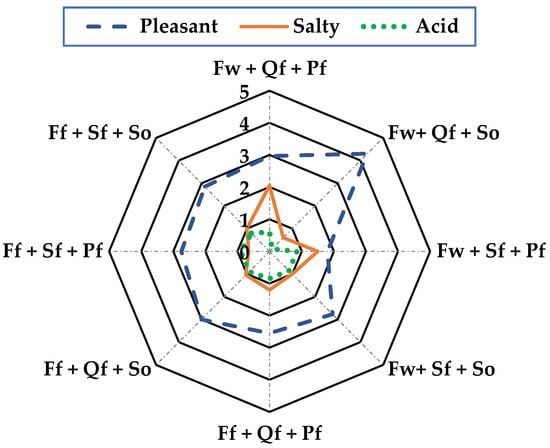 Taste in mouth evaluation of sausages of A. rivulatus. Ff: Fish farm, Fw: Fish wild; Sf: Soya flour, Qf: Quinoa flour; Pf: Pork fat, So: sunflower oil.