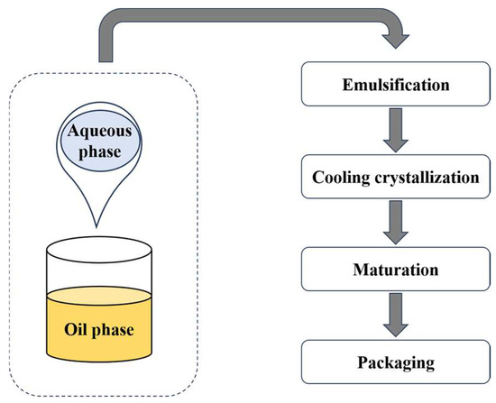 The aim of this work was to prepare trans fat-free margarine fats containing MLCTs and a certain amount of α-linolenic acid using a mixture of PSO, palm stearin (PS) and CO by interesterification using Lipozyme TL IM. The main processing steps of margarine include preparation of the water phase and oil phase, emulsification, cooling crystallization, maturation and packaging, as shown in Figure 1. To prepare margarine with suitable plasticity, pleasant mouthfeel and ideal crystal structure, we should first prepare a base stock with an appropriate melting point, low solid fat content (SFC) at body temperature and balanced fatty acid composition. In this study, PSO, PS and CO were used as raw materials for EI. The effects of EI on the physical and chemical properties (fatty acid and TAG composition, SFC, thermodynamic properties, etc.) of margarine base stock were investigated, and a new type of nutritional and healthy margarine fat was developed.