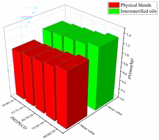 Lipid oxidation is a main cause of food spoilage [30], which not only generates off-flavors and destroys nutrients and bioactive compounds, but also forms potentially toxic compounds [31]. PV is used as an important indicator to evaluate the oxidation of fats and oils. The PVs of the mixed oils before and after interesterification are shown in Figure 2. The PVs of physical ternary mixtures were slightly lower than those of the corresponding interesterified oils, which is similar to the findings reported by Adhikari and Hu [32]. The reason for this may be attributed to the fact that the mixed oil itself contained a certain amount of natural antioxidants, such as tocopherols, which would protect oil from oxidation [33]. Generally, edible oils with a PV below 10 meq/kg are considered safe for consumption. In this study, the PVs of all the oil samples before and after interesterification were below 4 meq/kg, indicating that the interesterified oils are still fresh and healthy. Related studies have also demonstrated that interesterification has minimal impact on oil oxidative stability [26]. Therefore, EIE could be used as a reliable technology to produce trans-free structured lipids rich in α-linolenic acid.