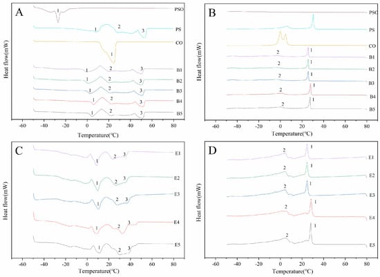Melting thermograms of (A) PSO, PS, CO, physical blends and (C) interesterified oil samples; crystallization thermograms of (B) PSO, PS, CO, physical blends and (D) interesterified oil samples. The peaks 1, 2 and 3 in Figure 4A,C represent the endothermic peaks in the melting process of the samples from −60 °C to 80 °C. The peaks 1 and 2 in Figure 4B,D represent the exothermic peaks in the crystallization process of the samples from 80 °C to −60 °C.