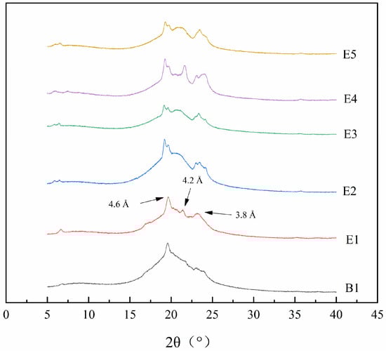 The performance of oil is closely related to its polymorphic structure. In an oil system, there are three types of polymorphic forms, that is, α, β′ and β, which are generated according to the different growth environments of the crystals [42]. X-ray diffraction is frequently employed to determine the polymorphic structure of lipids. The polymorphic forms of interesterified oils with different ratios of PSO, PS and CO were studied, and the results are shown in Figure 5. There were two types of diffraction peaks in sample B1: one was the β form at a short spacing of 4.6 Å, and the other was the β′ form at 3.8 Å. The crystal form of the interesterified sample (E1) was similar. In addition to 3.8 Å and 4.6 Å, the β′ form also appeared at 4.2 Å. This indicates that the interesterification promoted the transformation of the β form to the β′ form in oil. For plastic fats such as margarine, due to the small size of the β′ crystal and the large specific surface area, a delicate crystal network forms easily, which provides a better oral sensation [43]. The β′ type crystals of interesterified samples obtained in our study increased, indicating that this material is suitable for the production of margarine. Similarly, a plastic fat prepared using beef tallow, PS, and camellia oil also exhibited optimal β′ crystal [44]. Additionally, Xue and Wang [45] employed chemical interesterification to prepare a nutritional plastic fat rich in linolenic acid using lard and perilla seed oil. The results showed that when the ratio of lard to perilla seed oil was set as 8:2 and 7:3, the content of β′ crystal presented in the interesterified fats was as high as 67.76% and 74.30%, and the crystal was small and uniform, indicating they were suitable for the production of margarine.
