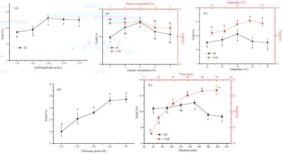Effect of different extraction factors on extraction yield of TFP: (A) solid–liquid ratio, (B) enzyme concentration, (C) temperature, (D) ultrasonic power, (E) duration. Note: different lowercase letters (a–e) in the same figure indicate significant differences (p < 0.05).