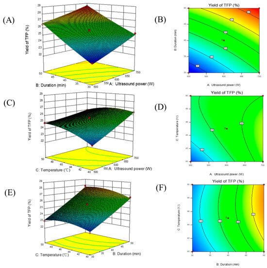 Three-dimensional response surfaces and the corresponding two-dimensional contour plots of the effects of ultrasound power, ultrasound time and temperature on the yield of TFP: (A,B) ultrasonic power and duration, (C,D) ultrasonic power and temperature, (E,F) duration and temperature.
