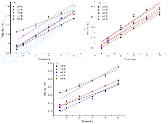 The relationship between ln[(y∞)/(y∞ − y)] and t with different extraction methods ((A): UAE, (B): UE, (C): EE).